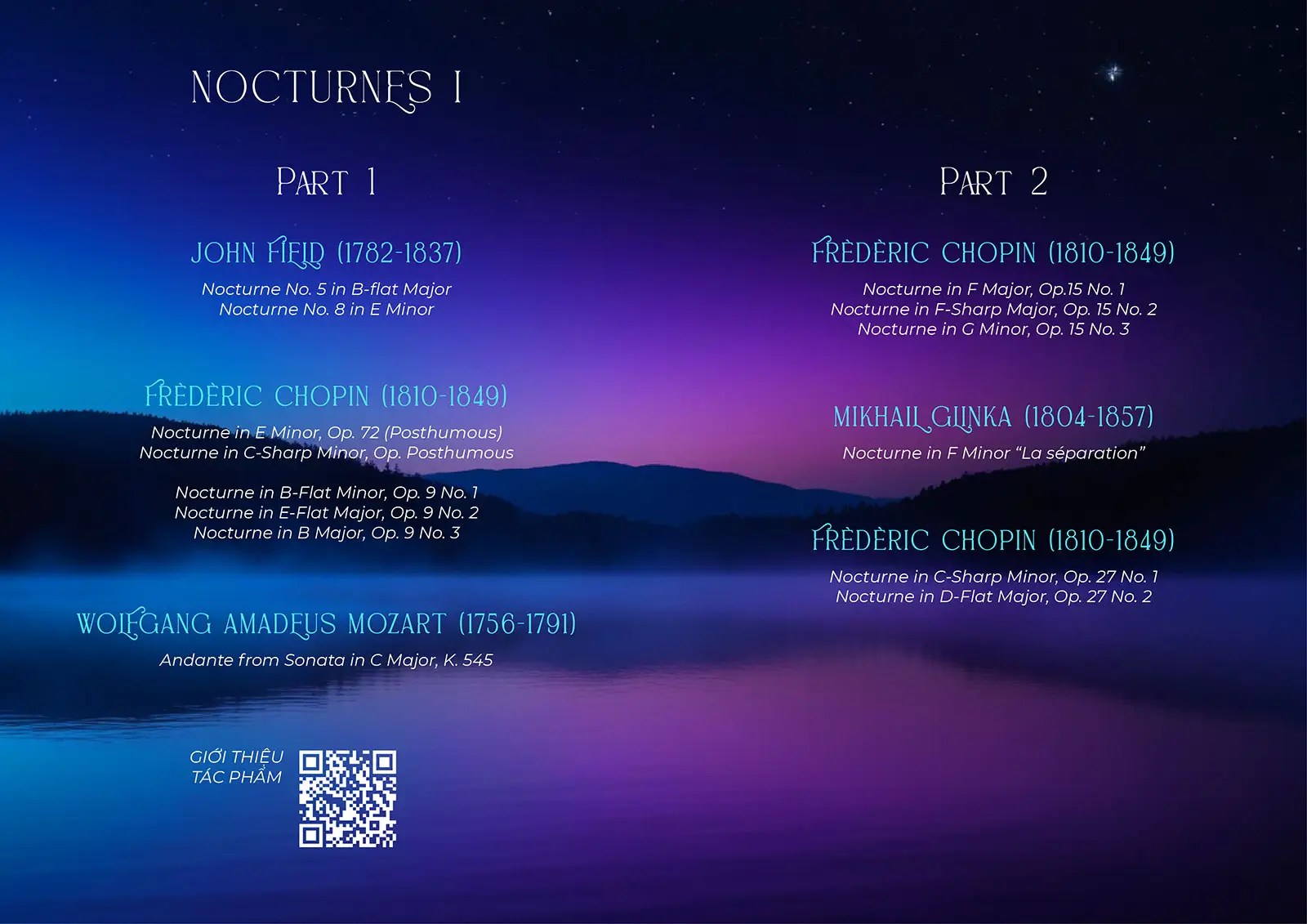 Dự án được ấp ủ có tên Nocturnes này sẽ diễn ra 2 đêm trong tháng 10 & 11. Nghệ sĩ/diễn giả coi đây là những khoảnh khắc tâm tình với những bản Nocturnes của Chopin, từ khi tác giả nhập môn thể loại này cho đến khi ông đạt được pháp của một bậc thầy. Bức tranh dạ khúc sẽ càng trở nên sinh động hơn với một số bản nhạc khác của Wolfgang Amadeus Mozart, John Field, Mikhail Glinka, Franz Liszt, Edvard Grieg, Claude Debussy.