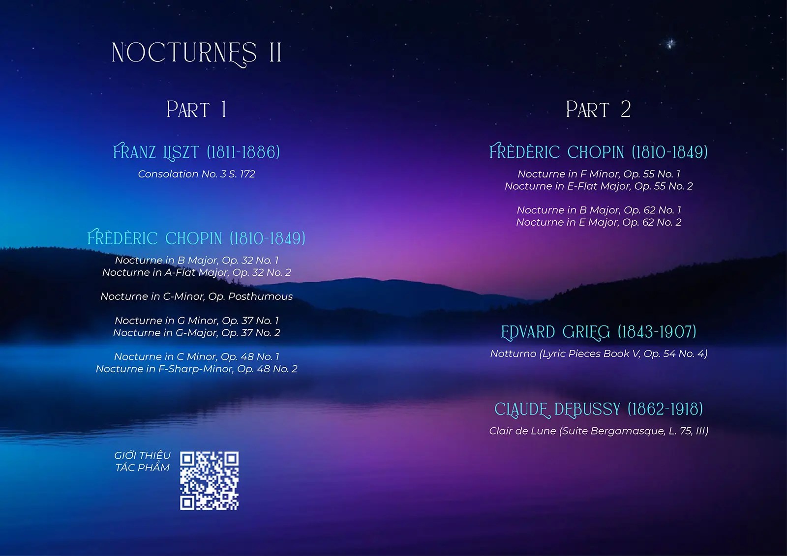 Nào, mời bạn cùng bước vào thế giới âm nhạc của màn đêm và khám phá cùng chúng tôi, nơi những giai điệu thanh thoát, tinh tế, yên bình, quyến rũ sẽ cất lên, nơi mỗi nốt nhạc như một lời thì thầm dưới nguyệt, mang đến cho thính giả những giây phút sâu lắng và tĩnh tại.