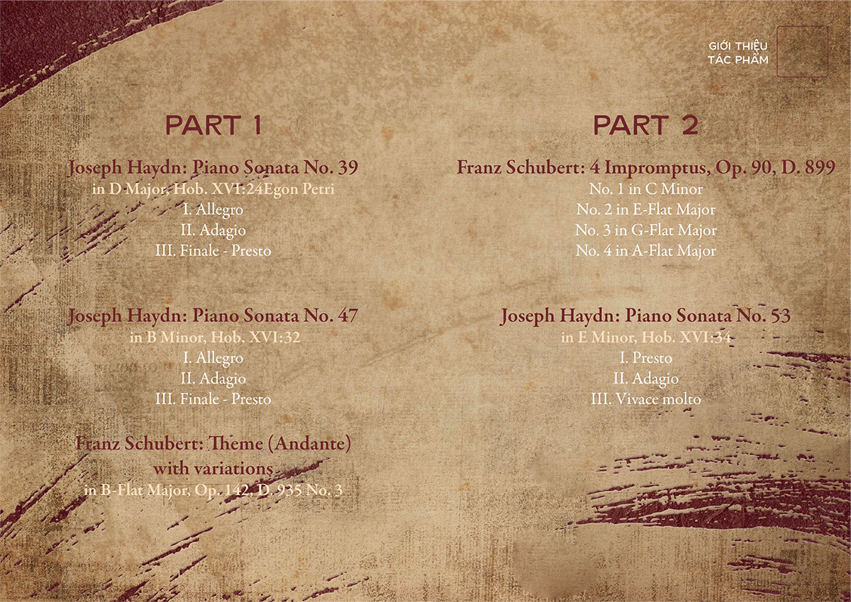 Là Haydn - vị "Cha đẻ của Giao hưởng" - với những bản Sonata chuẩn mực bậc nhất. Dù ở giọng Trưởng tươi sáng (Sonata số 39) hay giọng Thứ trầm tư (Sonata số 47 & 53), âm nhạc của ông vẫn luôn giữ nét duyên dáng, hài hòa và lý tính.
